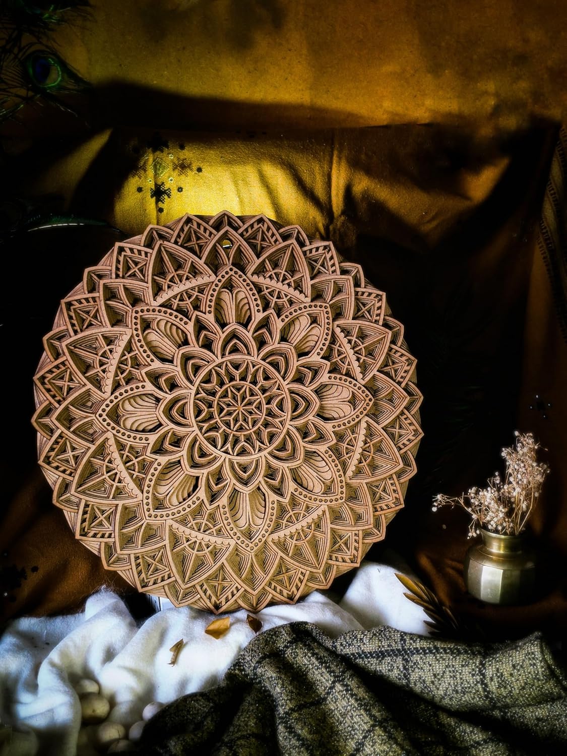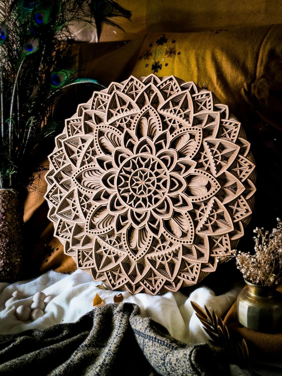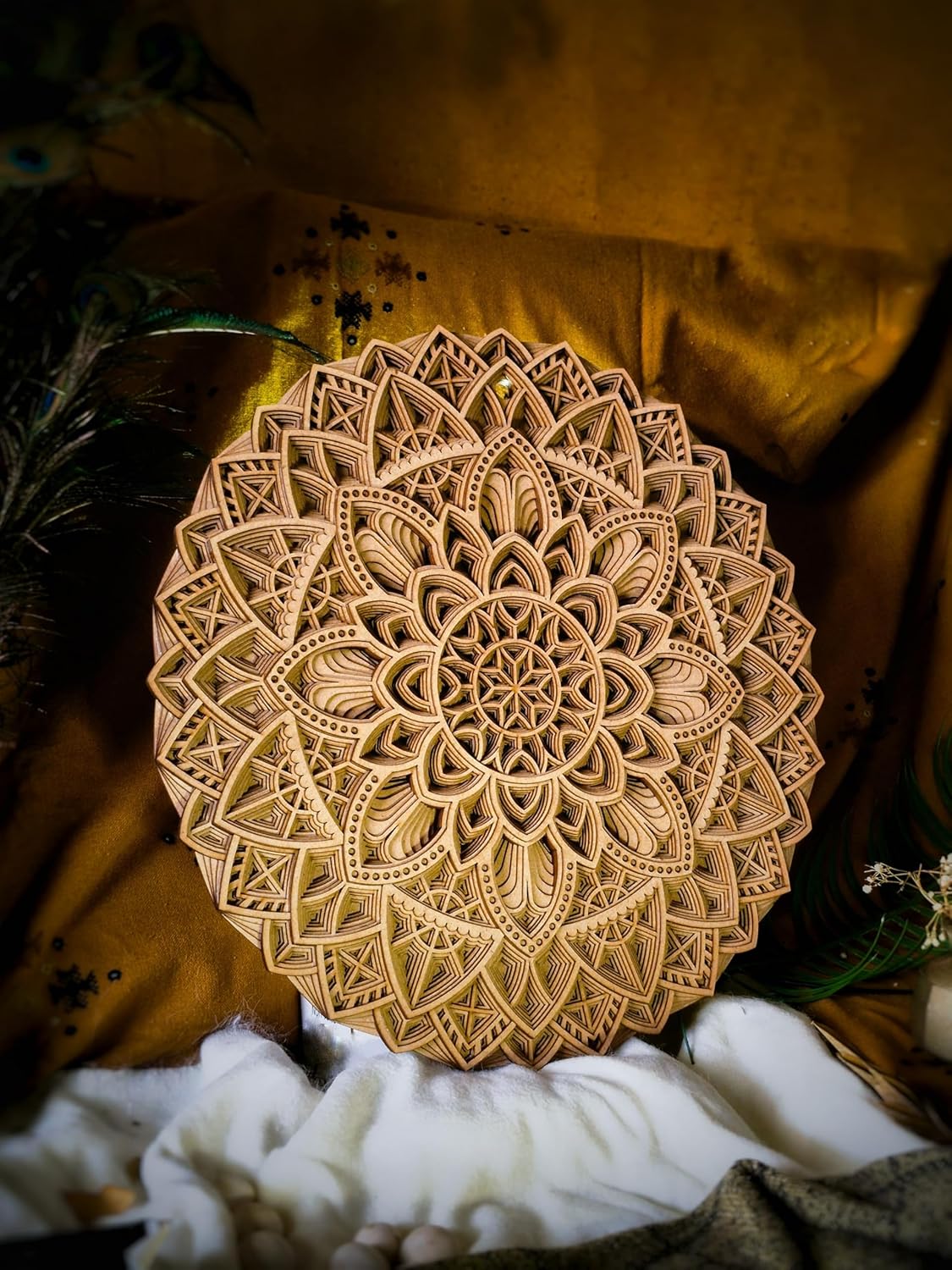 This 12" x 12" multilayer Mandala wall art is beautifully crafted from laminated pine wood and finished in vibrant multicolors. With its intricate detailing and artistic depth, it brings a classic yet modern charm to your home décor, making it perfect for living rooms, bedrooms, or meditation spaces.